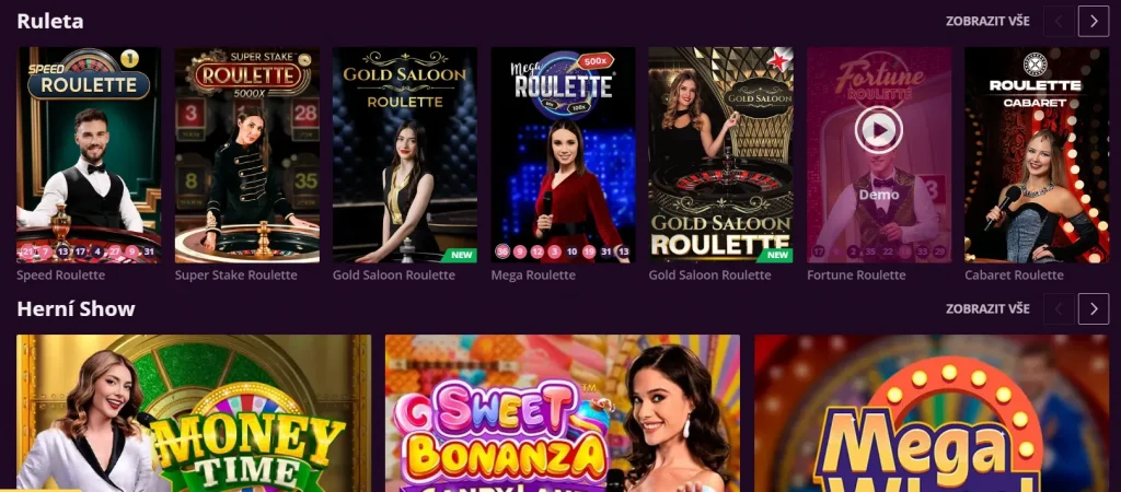 Automaty tvoří největší část lobby – od jednoduchých tříválcových her až po komplexní video sloty s Megaways mechanikami, bonusovými koly a free spiny. Mezi populární tituly patří například Gonzo’s Quest Megaways, Buffalo Trail a další hry s velkým výherním potenciálem. Hry se liší volatilitou, výší možných výher i herními funkcemi, takže si vybere jak rekreační hráč, tak lovec velkých výher.