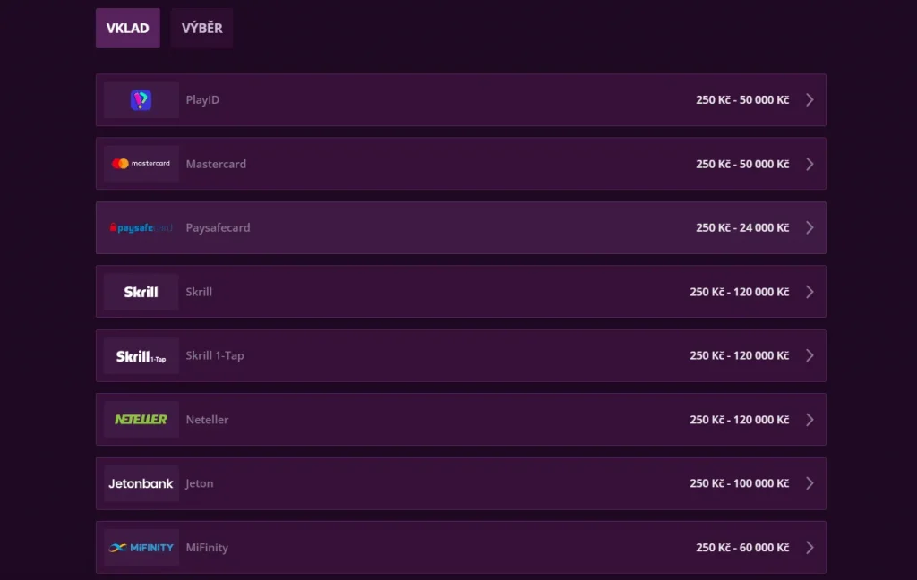 Většina vkladů je zpracována okamžitě, zatímco výběry trvají obvykle 1–3 dny po schválení žádosti a ověření účtu. Minimální částka pro vklad se často pohybuje kolem 10–20 €, u výběrů mohou být limity v závislosti na zvolené metodě a hráčské úrovni.